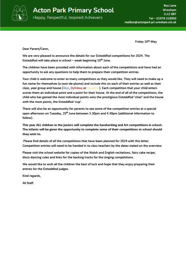 Please see below the letter that was distributed to parents about the Eisteddfod competitions. There are also links to the Infant and Junior pages to view more details.